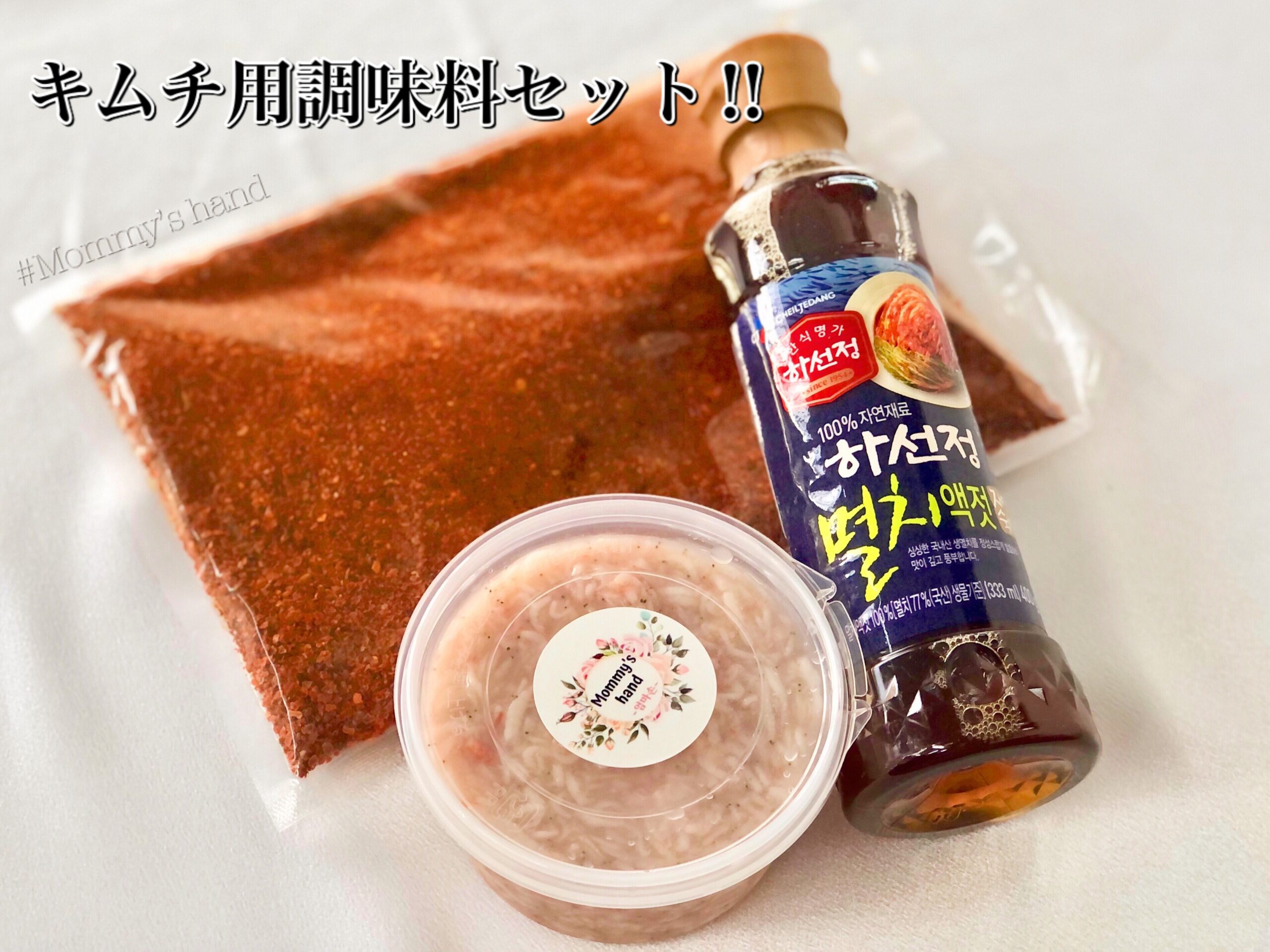キムチを漬けるときに必要なキムチ用唐辛子、アミの塩辛、イワシエキス。